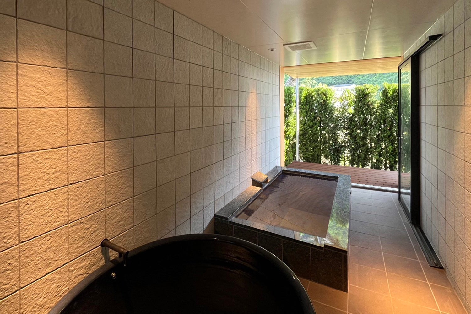 ◎潮騒の音色に包まれた寛ぎの半露天風呂とプライベートサウナを完備