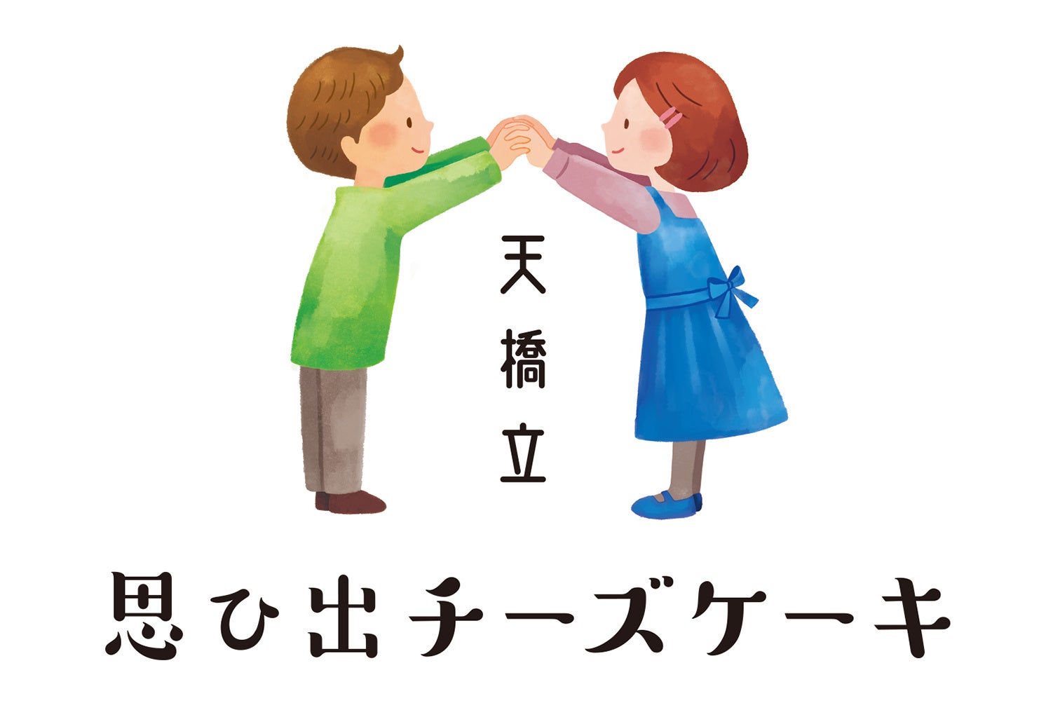 天橋立思ひ出チーズケーキのパッケージや店舗デザインには、イラストレーター 有村綾さんが描き起こした女の子と男の子が手をつなぎ、架け橋をつくるイラストを使用しています。