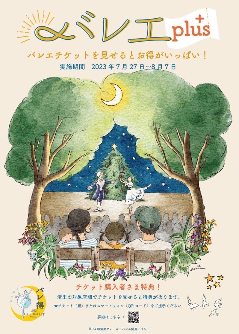 NPO法人清里観光協会主催でバレエ期間中の7月27日~8月7日(※8月2日の休演日も含む)、清里地域の対象店舗でバレエチケットを見せるとお得な特典を受けられるイベント「バレエplus+」を初開催いたします。