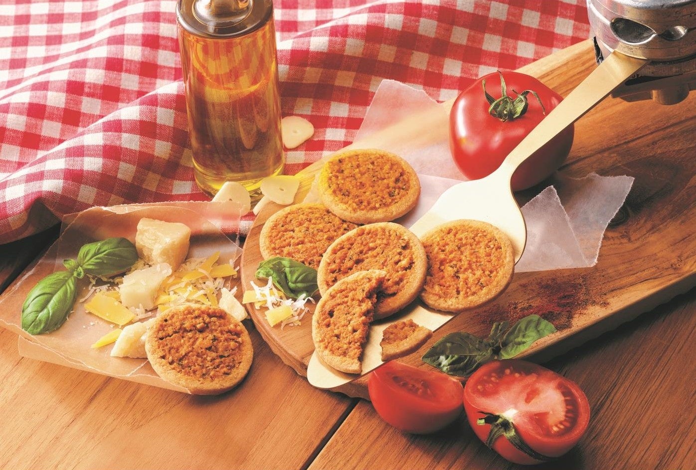 トマトパウダーやハーブ、スパイスなどの風味が広がる生地と、3種のチーズパウダーを練りこんだ生地の2つが織りなすハーモニーはまるでピザを食べているかのよう!