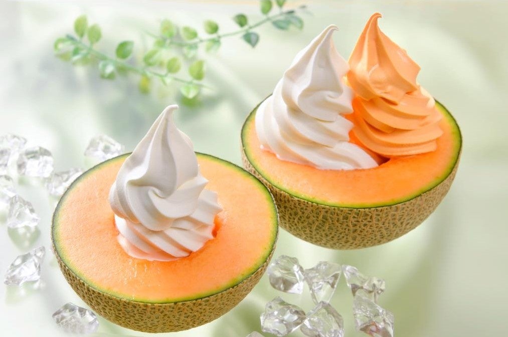 メロン半玉の上には、北海道産生乳を使用した「ミルクソフトクリーム」と夕張メロン果汁を使用した「夕張メロンソフトクリーム」の2種を贅沢にのせました。