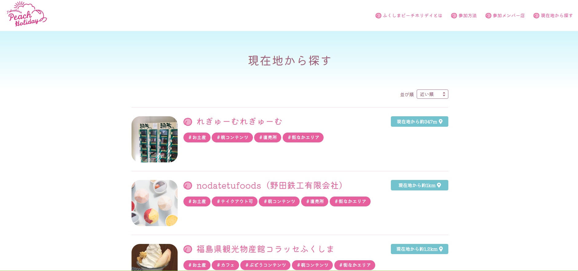 また、サイトには現在地から付近の参加店情報を検索できる機能を設けました。福島市を初めて訪れる土地勘のない訪問客でも、気軽に参加店を巡り旬の桃を楽しむことができます。