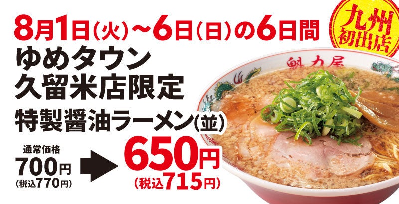 この度九州エリアでの初出店を記念して、「ゆめタウン久留米店」にご来店いただいたお客様には、『特製醤油ラーメン(並)』を650円(税込715円)で販売いたします。