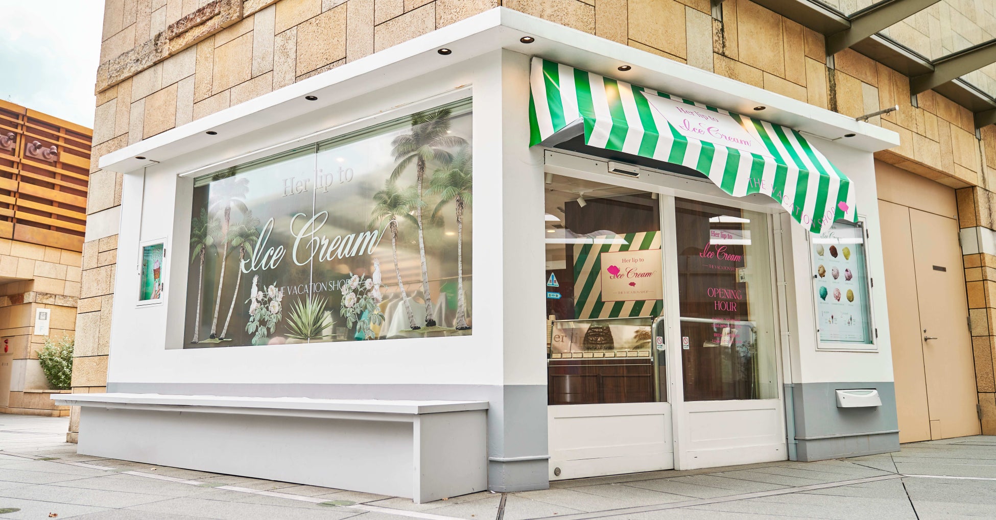 ヴィンテージトロピカルな空間で夏を楽しむアイスクリームショップ。店内ではアイスクリームやドリンクの他、オリジナルアイテムを販売。