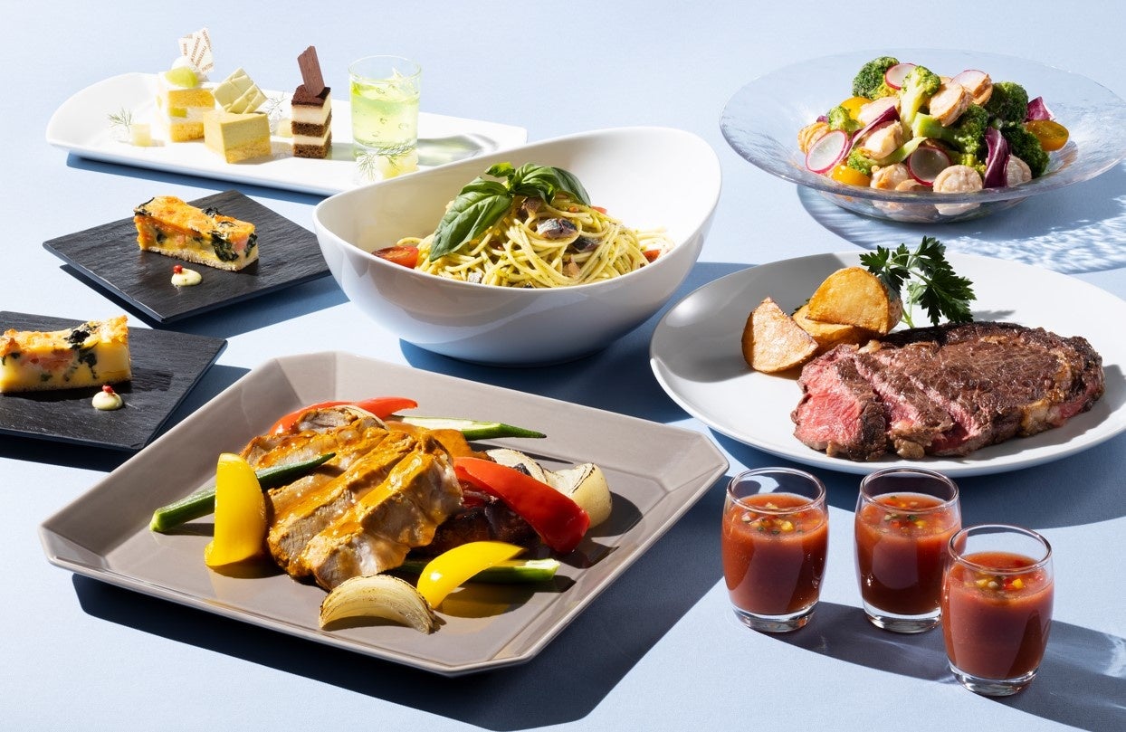 テーマは「夏の北海道」。旬の北海道産食材を使用したメニューを多数ご用意いたしました。「北海道産牛肉のローストビーフ」や「蝦夷鹿挽肉と茄子のボロネーゼピッツァ」、「ハンバーグステーキ はやきたカチョカバロチーズと共に」など、北海道ならではのメニューをご提供いたします。お盆期間限定のスペシャルバイキングでは、「神内あか牛肩ロース肉の炙り焼き」や「上富良野町産骨付き豚ロース肉のロースト」などのライブクッキングをはじめ、「海の幸丼」や「稚内産つぶ貝と北海道産マッシュルームのレモンバター焼き」などが登場。世代を問わず、ご家族皆様でお愉しみいただけるよう工夫を凝らし、北海道を満喫できるメニューを取り揃えました。想い出づくりの夏休みに、ぜひご利用ください。
