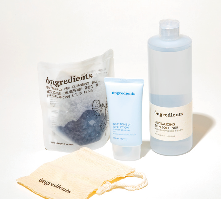 〈Ongredients〉●左:バタフライピークレンジングボール(1個)1,600円 ●中央:ブルートーンアップサンローション(50ml)2,500円 ●右:リバイタライジングスキンソフナー(400ml)2,800円