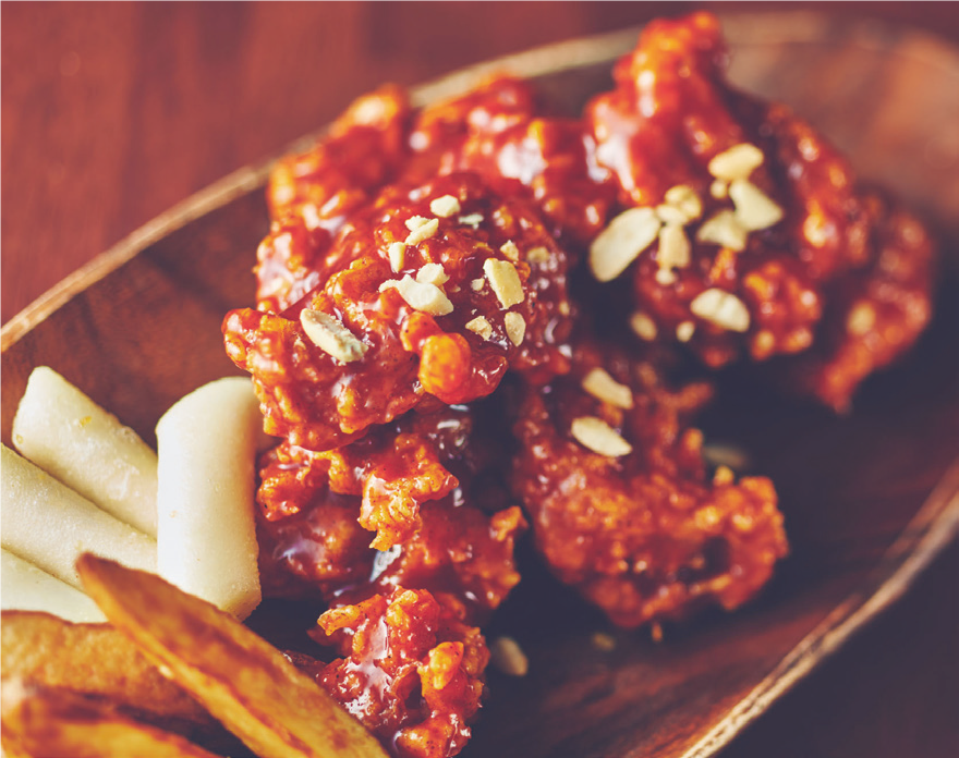 カリカリの韓国フライドチキンに甘辛の特製、ヤンニョムソースを絡めたペダルチキンのイチオシ商品!