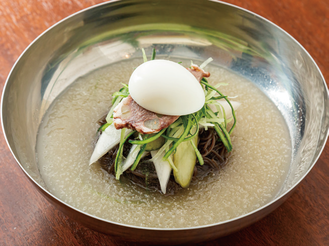 コシのある麺にたっぷりの具材をのせた韓国冷麺です。 シャーベット状に凍らせたスープが、暑い夏の食欲をアップ!