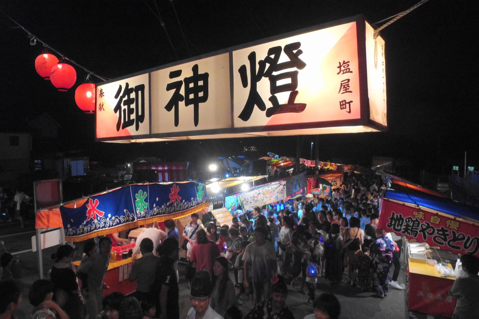 70年以上の歴史を持つこの祭りは、毎年7月27日と28日の2日間にわたって行われる、神﨑神社(かんざきじんじゃ)の例大祭として知られています。7月27日の前夜祭では、普段は静かな菊港が一変。約40店舗もの露店がずらりと立ち並び、古き良き時代へタイムスリップしたかのような、エモーショナルで賑やかな雰囲気に包まれます。そして、この祭りの中心ともいえる儀式の一つとして、ご神体が神輿に乗って菊港の御旅所へと向かい、厳かな神事が執り行われます。