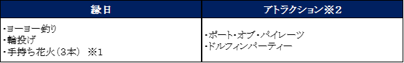 | 【開催日時】 2023年8月26日(土)・27日(日) 19:00~21:30(最終入場20:45)【料 金】 おとな(高校生以上):3,400円 小・中学生:2,200円 幼児(4才以上):1,700円【内 容】 ・閉館後の水族館入場券(19:00~21:30) ・盆踊り ・ドルフィンパフォーマンス(ナイトver.)「瑠璃花火-Digital Fireworks-」 ・まつりチケット 2枚 【まつりチケット】は、以下の内容より1枚につき1コンテンツご利用いただけます。ご利用当日の追加購入も可能です(2枚セット1,000円) |