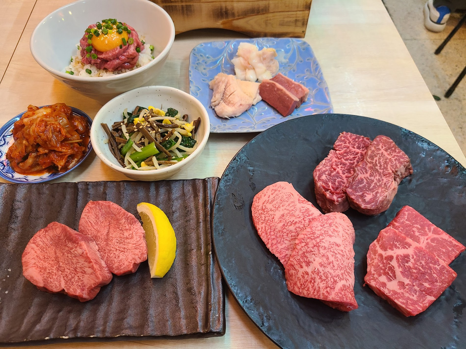 上ハラミと上ロースの贅沢な味わい、ネギたんの繊細な風味、さらには5種類のホルモンの濃厚な旨みが楽しめます。キムチやナムルのピリ辛さがアクセントとなり、お腹いっぱい満足感を与えるセットです。