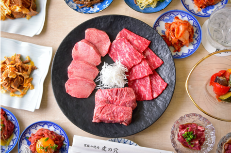 ワンランク上の上質な和牛ハラミ、ロース、カルビに加え、厚切りタン元とホルモン3種類と名物のユッケ丼が締めくくる贅沢な組み合わせをお値打ち価格で楽しめます。