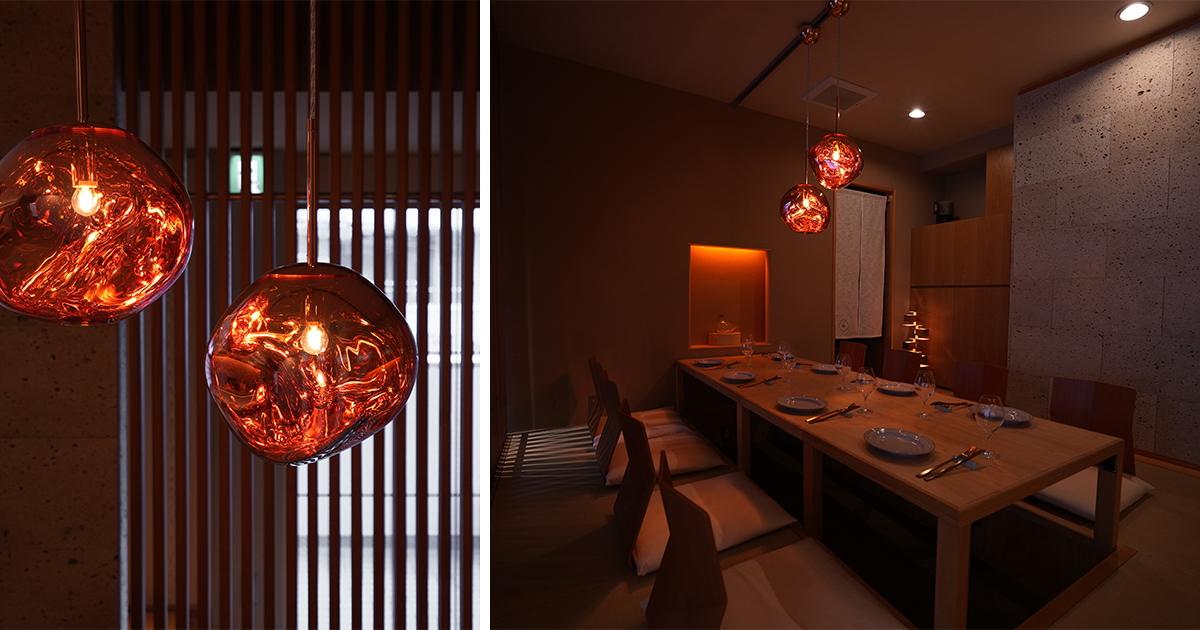 畳や障子、格子を使った温かみのある和風建築と近代的でミニマルな照明を掛け合わせたモダンでスタイリッシュな空間。レコードの音楽を聴きながら、サイフォンのコポコポと湧き上がるお湯やフラスコにコーヒーが溜まっていく過程を見て楽しんでいただけるようにカウンター席もご用意。