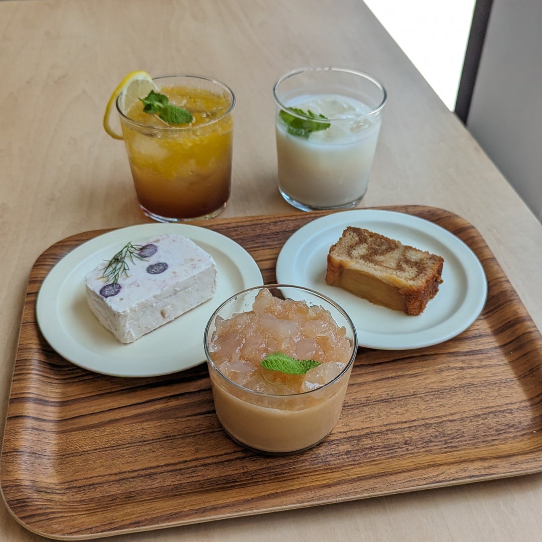 暑い夏にぴったりなオリジナルドリンクを2種、スイーツ(ムース/アイス/焼き菓子)を3種ご用意。