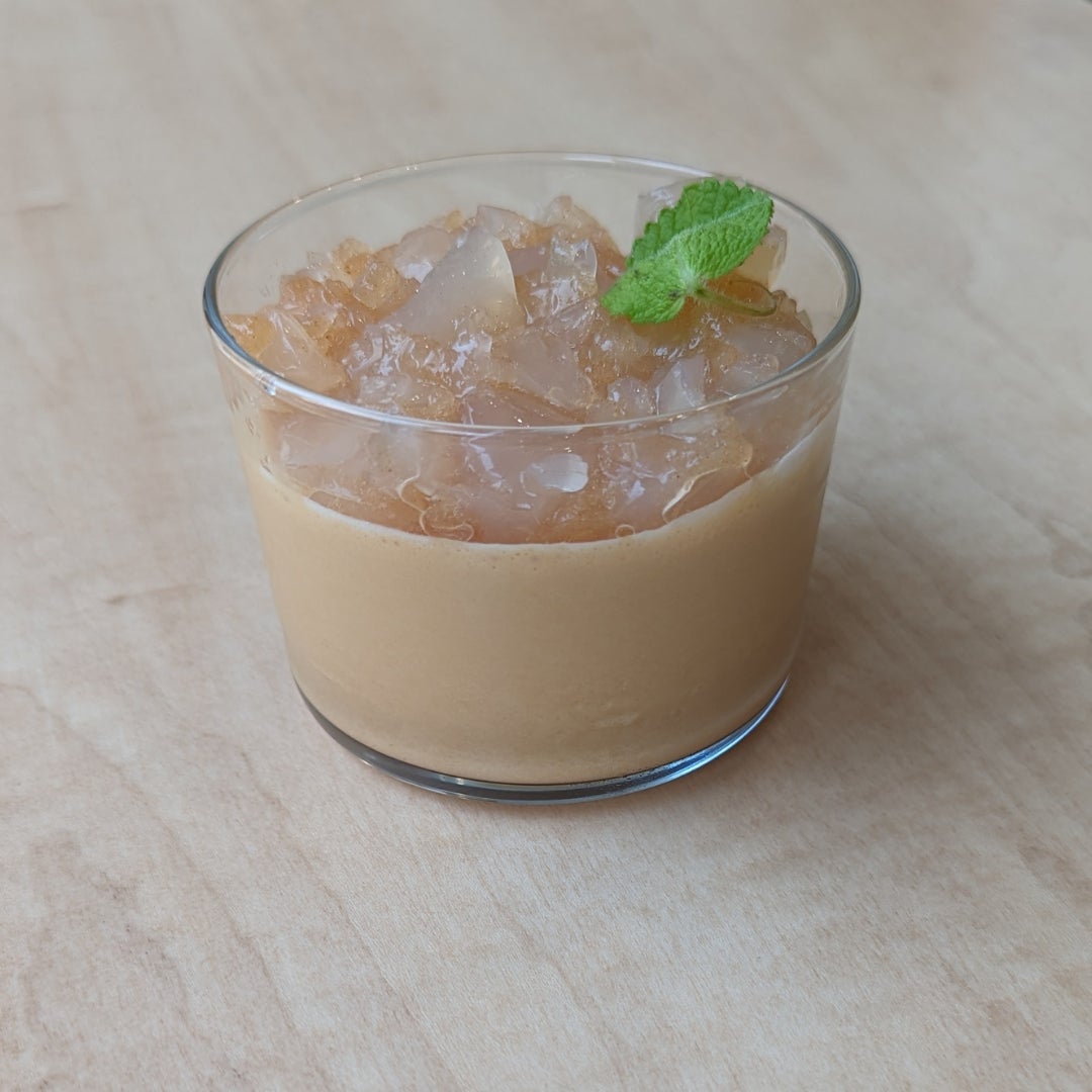 キャラメルムースの上に VYBESシナモン洋梨ゼリーをトッピングした濃厚ムース