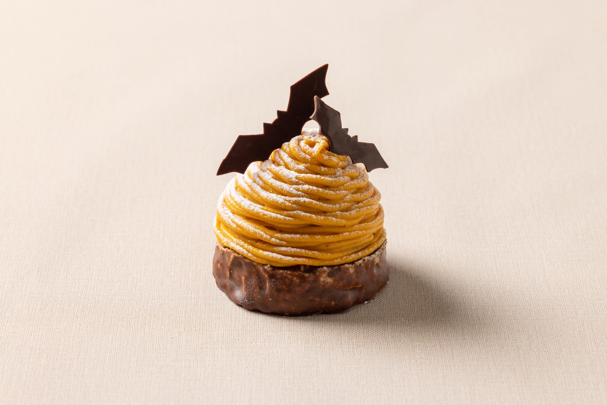 国産かぼちゃをつかったほっくり甘い濃厚なクリームを、無糖の生クリームの上に絞った、素材の味わいが生きるスイーツ。トップにはチョコレートのコウモリをあしらった、ハロウィンシーズンにもぜひ召し上がっていただきたい一品です。
