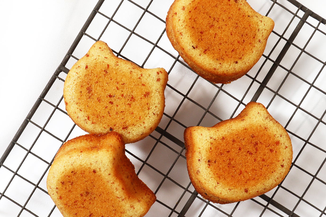 ティータイムのお供にぴったりなねこの形のフィナンシェ。しっとりとした食感と、バターの豊な香りをお楽しみいただけます。さらに、皮付きのアーモンドときび砂糖を使用することにより、コクと香りをよりお楽しみいただけるよう仕上げました。