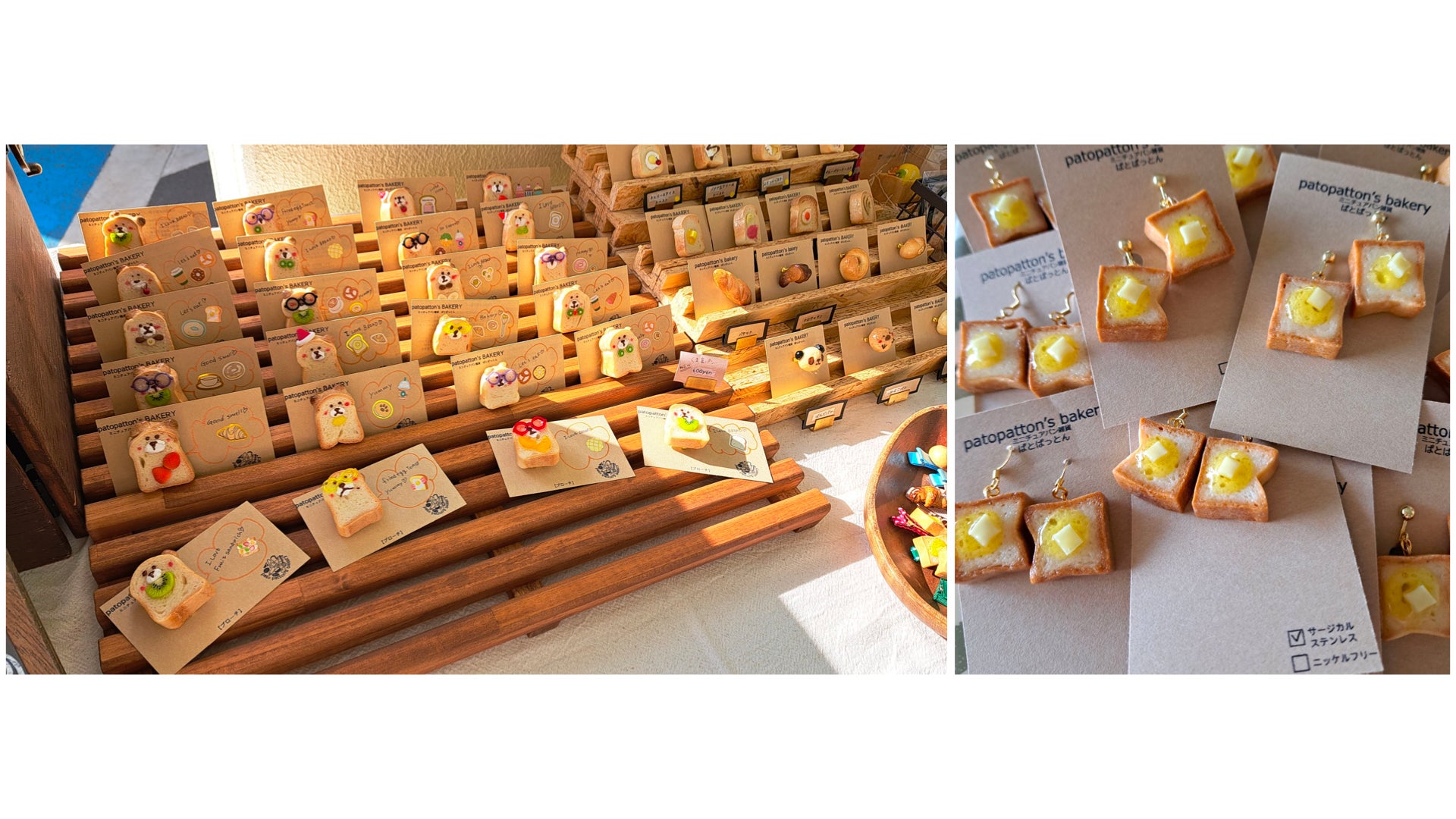 本物のパンを小さく焼き上げ、ブローチやマグネット等に加工しています。小麦粉・砂糖・油脂・イースト等を使用し焼き上げたミニチュアパン。小さいながら、本物のパンの焼き色や質感を感じられる雑貨です。