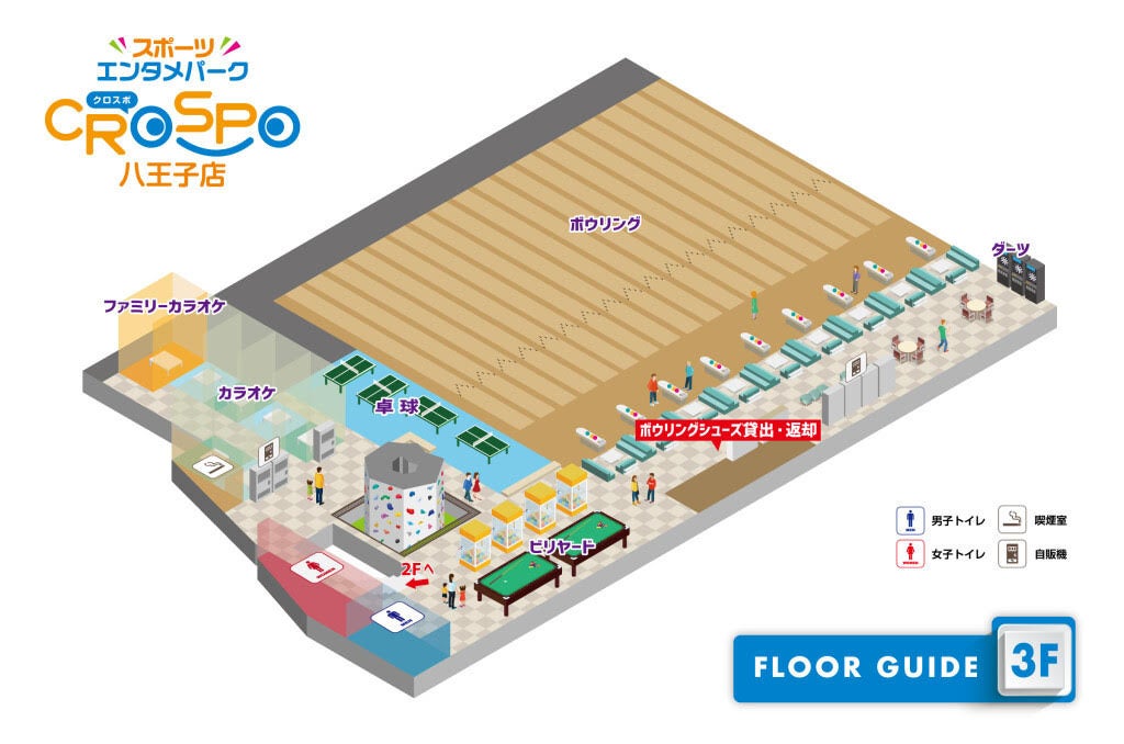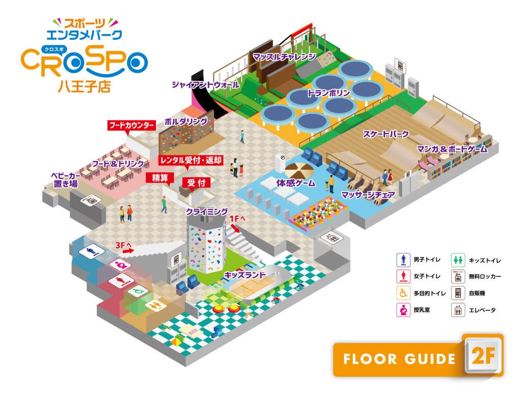 スケートパーク・マッスルチャレンジ・クライミング・ボルダリング・ボウリング・トランポリン・卓球・ビリヤード・ダーツ・カラオケ・ファミリーカラオケ・キッズランド・マンガ・ボードゲーム・ビデオゲーム・アーケードゲーム・クレーンゲーム・ジャイアントウォール