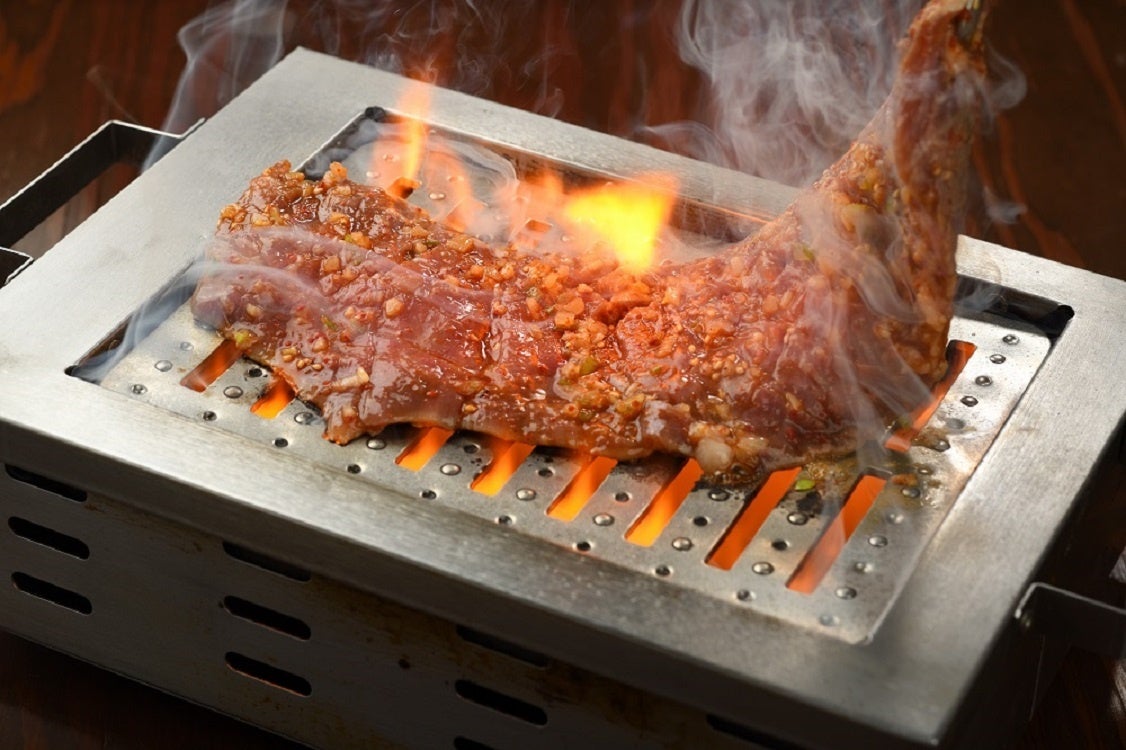 ホルモン焼きの場合【炭火+網】では、ホルモンの水分が必要以上に網の下へと流れて行き、更には炭の遠赤外線効果で乾燥した状態に焼きあがってしまいます。そのため食樂では、【ガス+鉄板】のスタイルにしています。