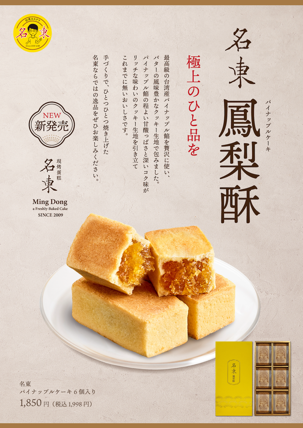たくさんのお客さまにご要望をいただいておりました。台湾カステラの名店、名東が手掛ける特製のパイナップルケーキを、8月11日(金)より吉祥寺店、オンラインショップにて販売開始いたします。