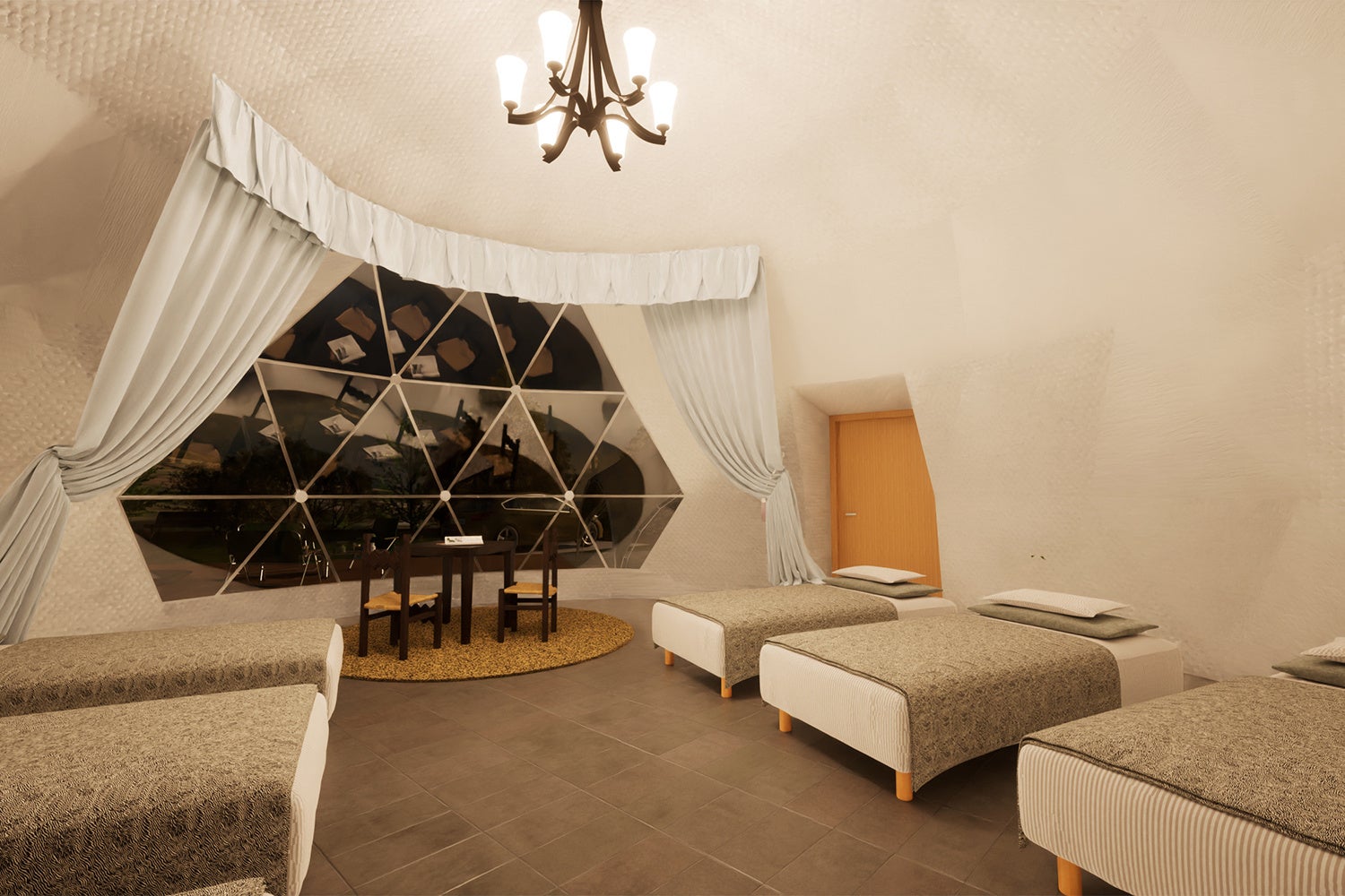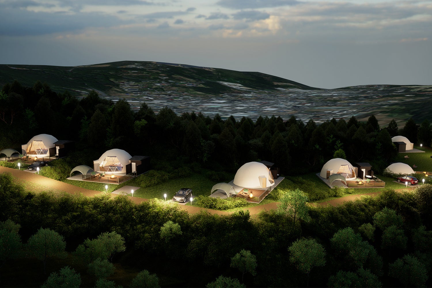 各棟100㎡を超える専有面積を確保し、隣接するお部屋と距離をとったプライベート感のある配置となっております。ドームテントはエリアでは希少な直径8m。