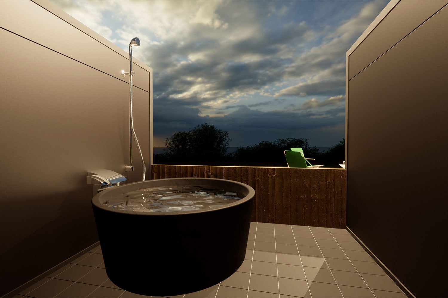 敷地内に湧き出る源泉を使用した客室温泉、太平洋の絶景を望む非日常空間。