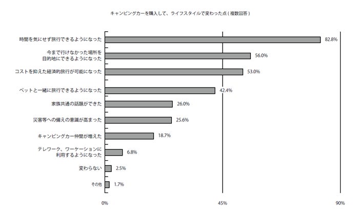 JRVAが全国のキャンピングカーユーザーを対象に、キャンピングカー購入後のライフスタイル変化について調査した所、「時間を気にせずに旅行ができるようになった」「今まで行けなかった場所を目的地にできるようになった」という回答が多く見受けられました。これは、公共交通機関ではたどり着くことができない場所、もしくは、宿泊施設のない場所での宿泊などを目的地として、キャンピングカーの利便性を発揮した使い方をしている証しと考えられます。また、「災害等への備えの意識が高まった」と答えたオーナーが25.6%となり、キャンピングカーが防災対策として認識されていることも分かりました。レジャー用途、防災、テレワークなど、いろいろな使い方が提案されているキャンピングカーが、実際にオーナーのライフスタイルに変化を及ぼしていることが見えてきました。