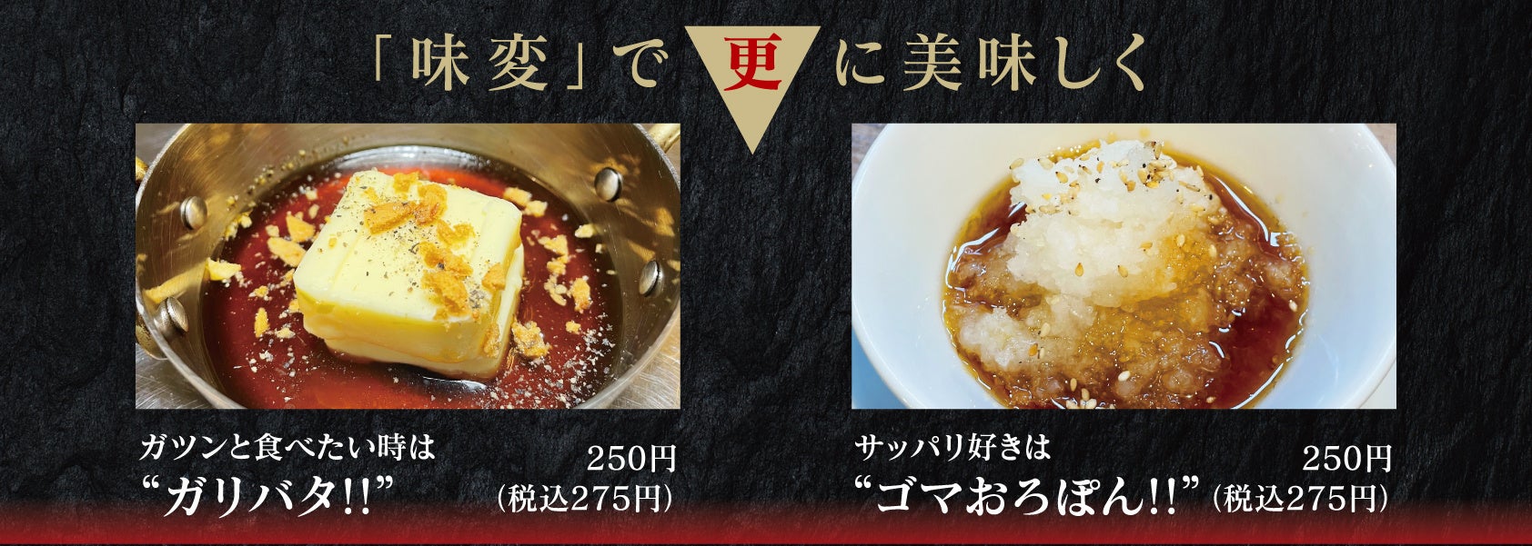 さらに黒毛和牛A4特上ロースによく合うトッピングも2種類ご用意。ガツンと食べたい気分の時はニンニクとバターの組み合わせがたまらない『ガリバタ!!』、さっぱりとした味わいを楽しみたい時は、大根おろしにぽん酢+ごまをアクセントに加えた『ゴマおろぽん!!』がおすすめ。「味変」でさらにバリエーション豊かに、その味わいをお楽しみいただけます。