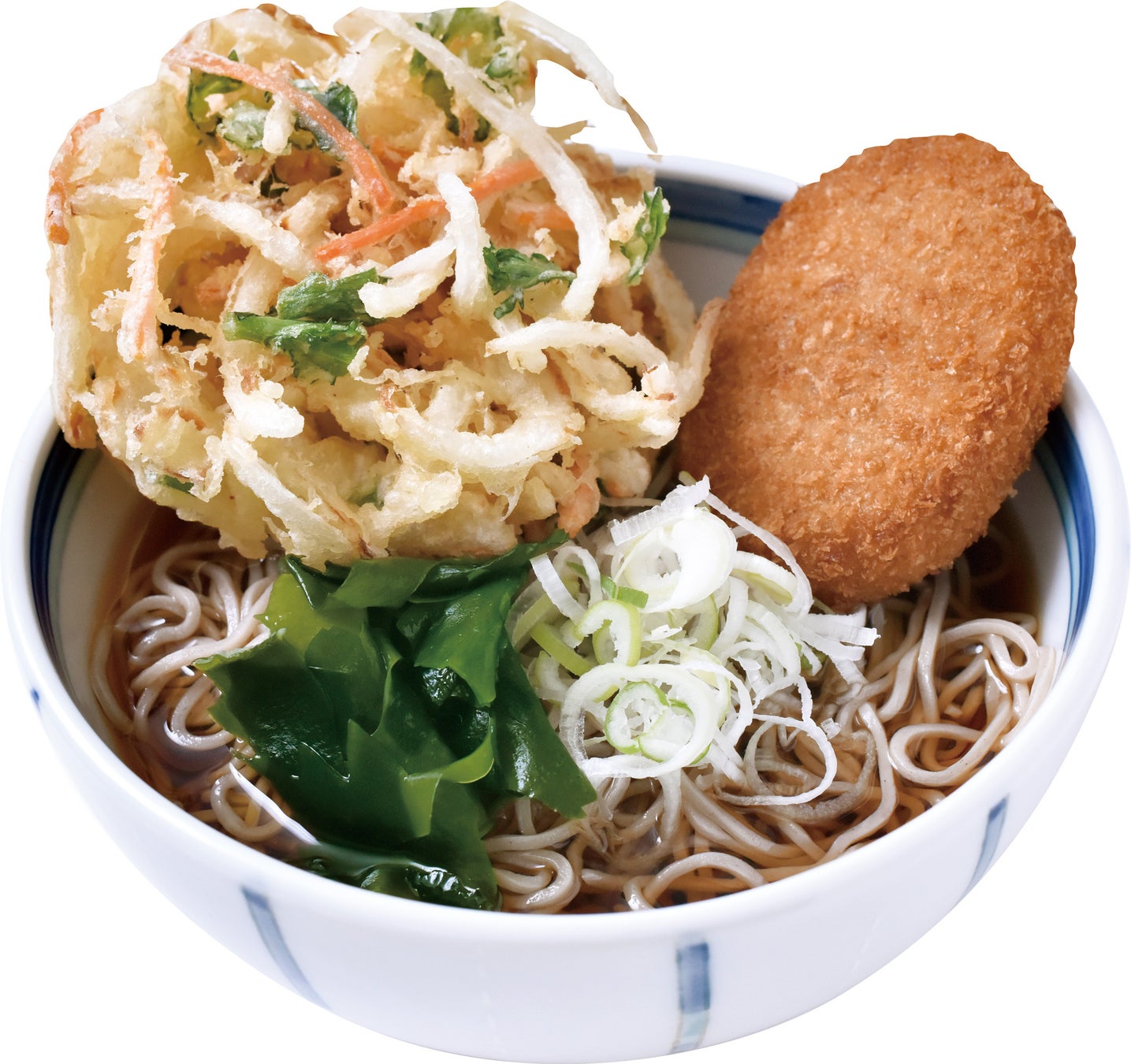 8月26日(土)~28日(月)の3日間はオープニングキャンペーンとして、人気のツートップであるかき揚げ天とコロッケカレー味をトッピングし、麺を1.5玉に増量した「特盛りそば」を620円で販売いたします。