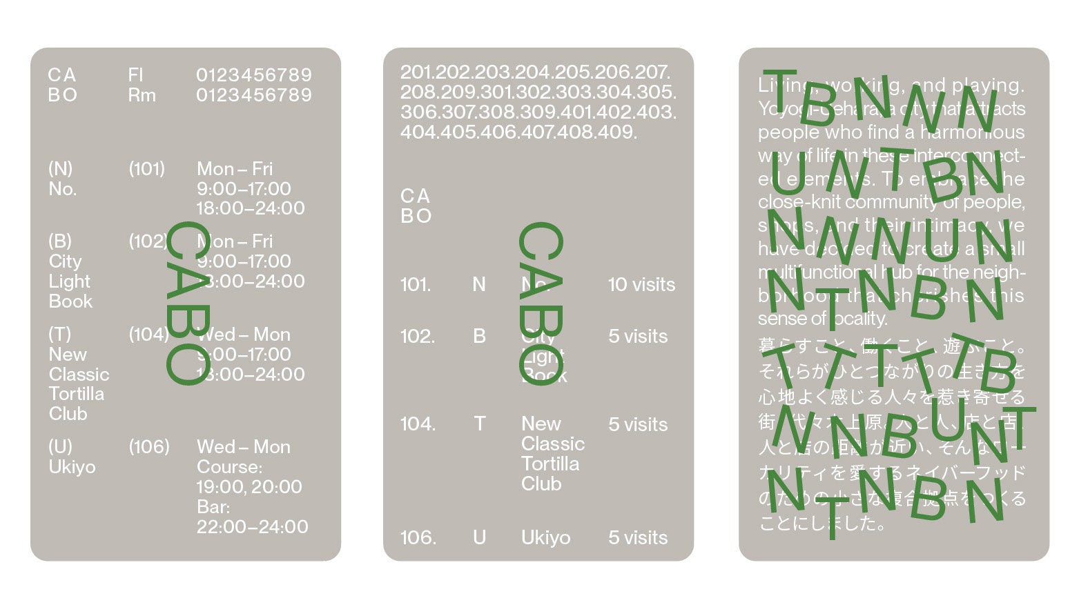 1Fの『No』.を運営する301がカードの企画開発を行い、上階に入居するブランディング・エージェンシー『The Carpenter & The Stone』がカードのデザインを行うなど、施設の仕組みを入居者同士のコラボレーションで実現していく手法を取り入れています。