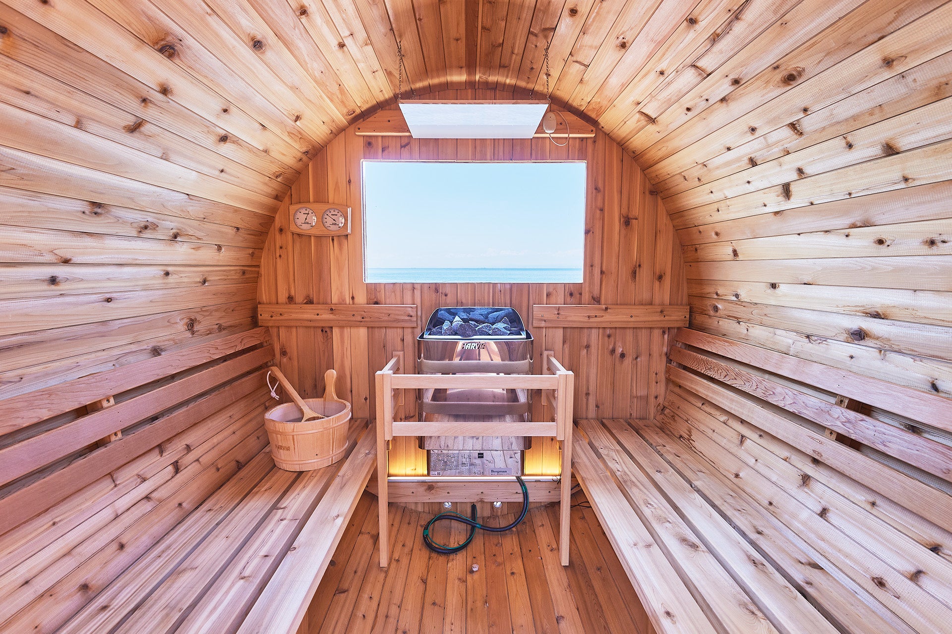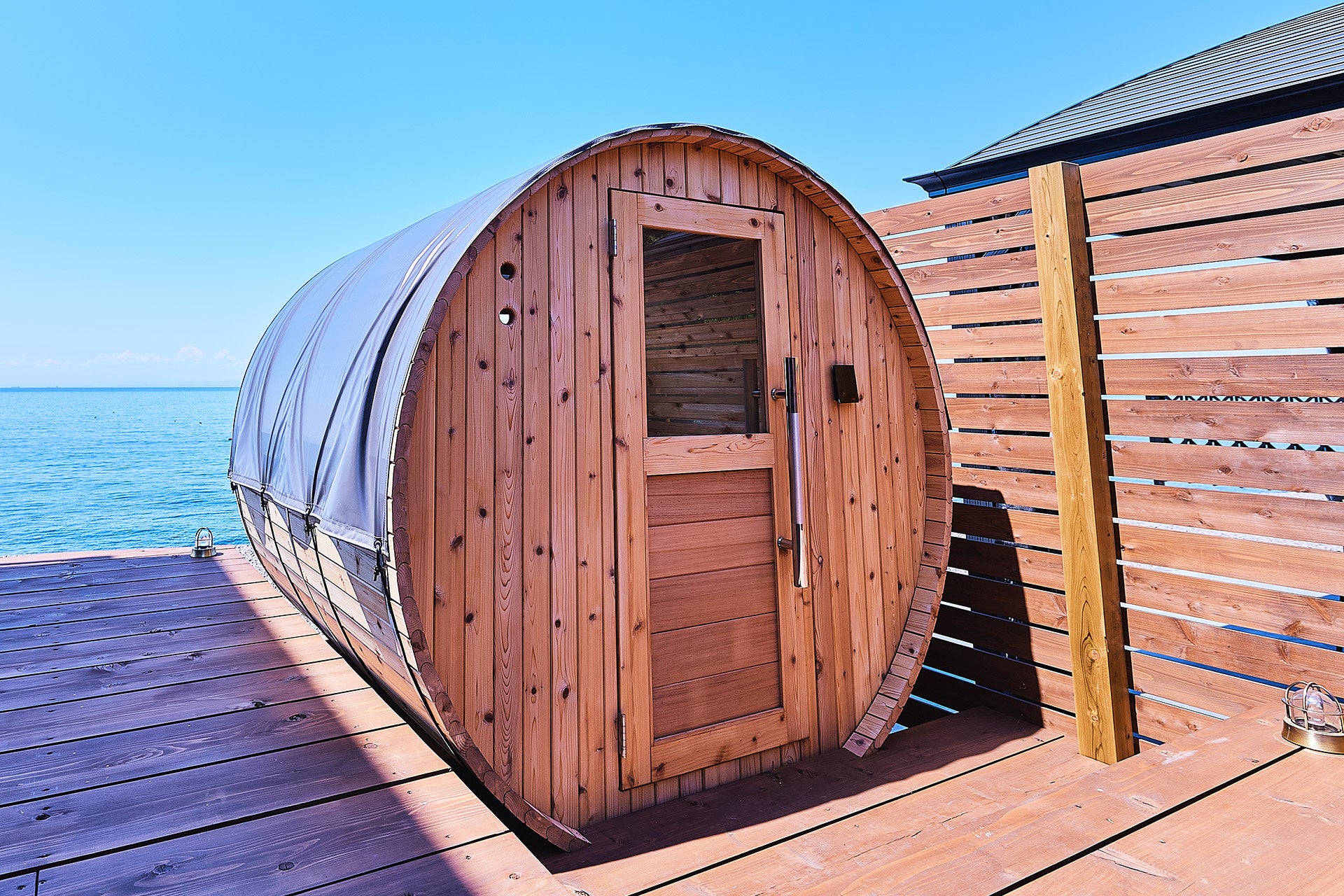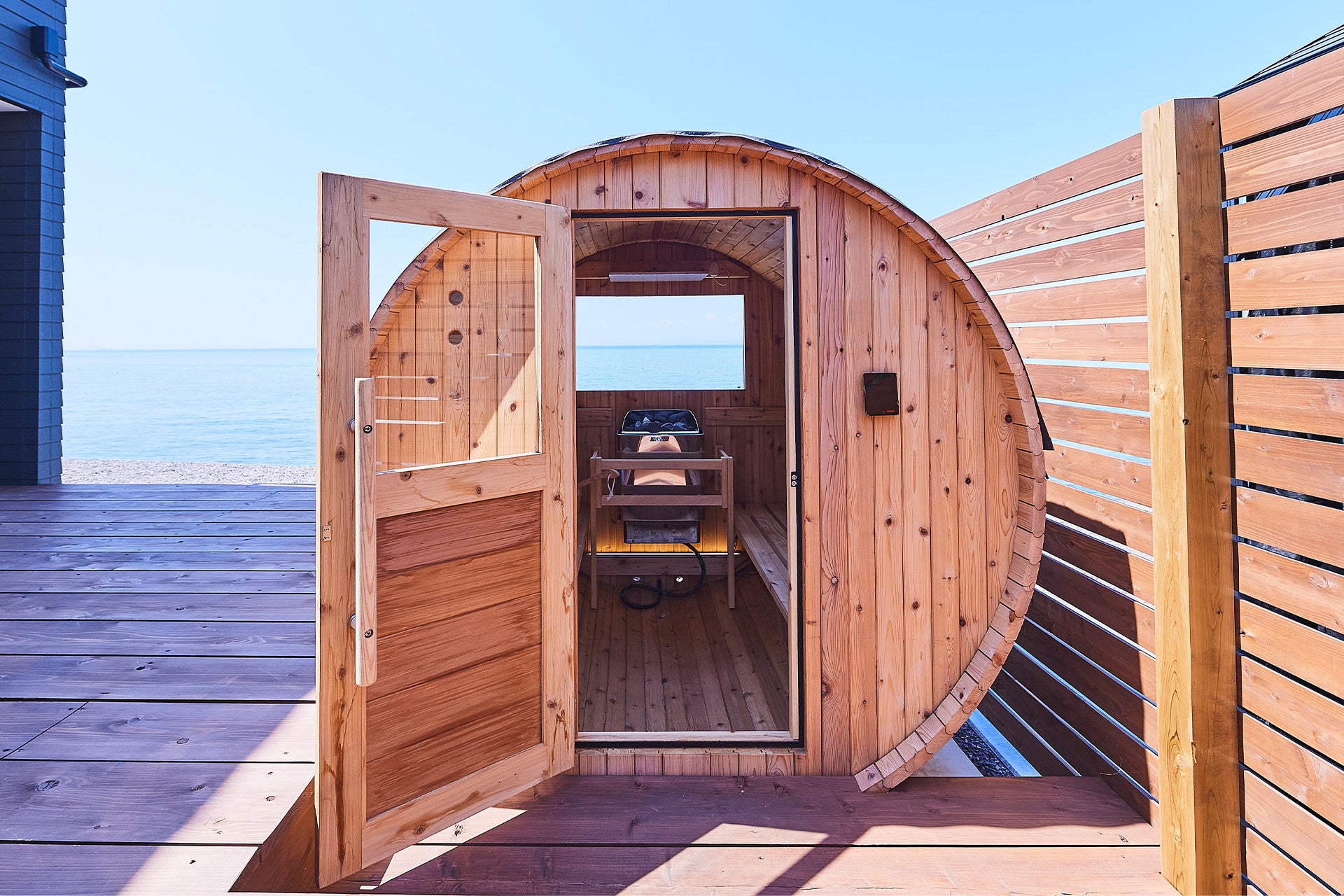 中庭に併設されたバレルサウナは、円筒型の形状から室内の熱が均等に広がりやすく、檜の香りに包まれる空間です。サウナから海を望み、水風呂のあとは波音を聞きながら「ととのう」を体感いただけます。
