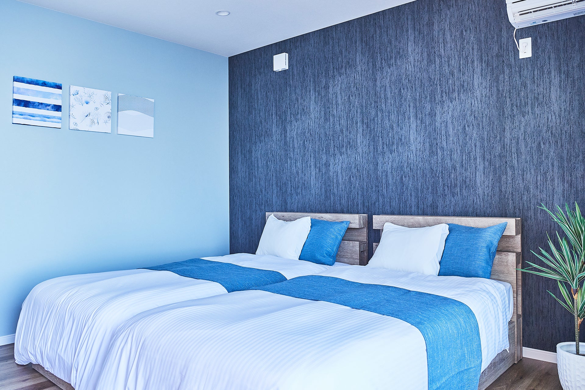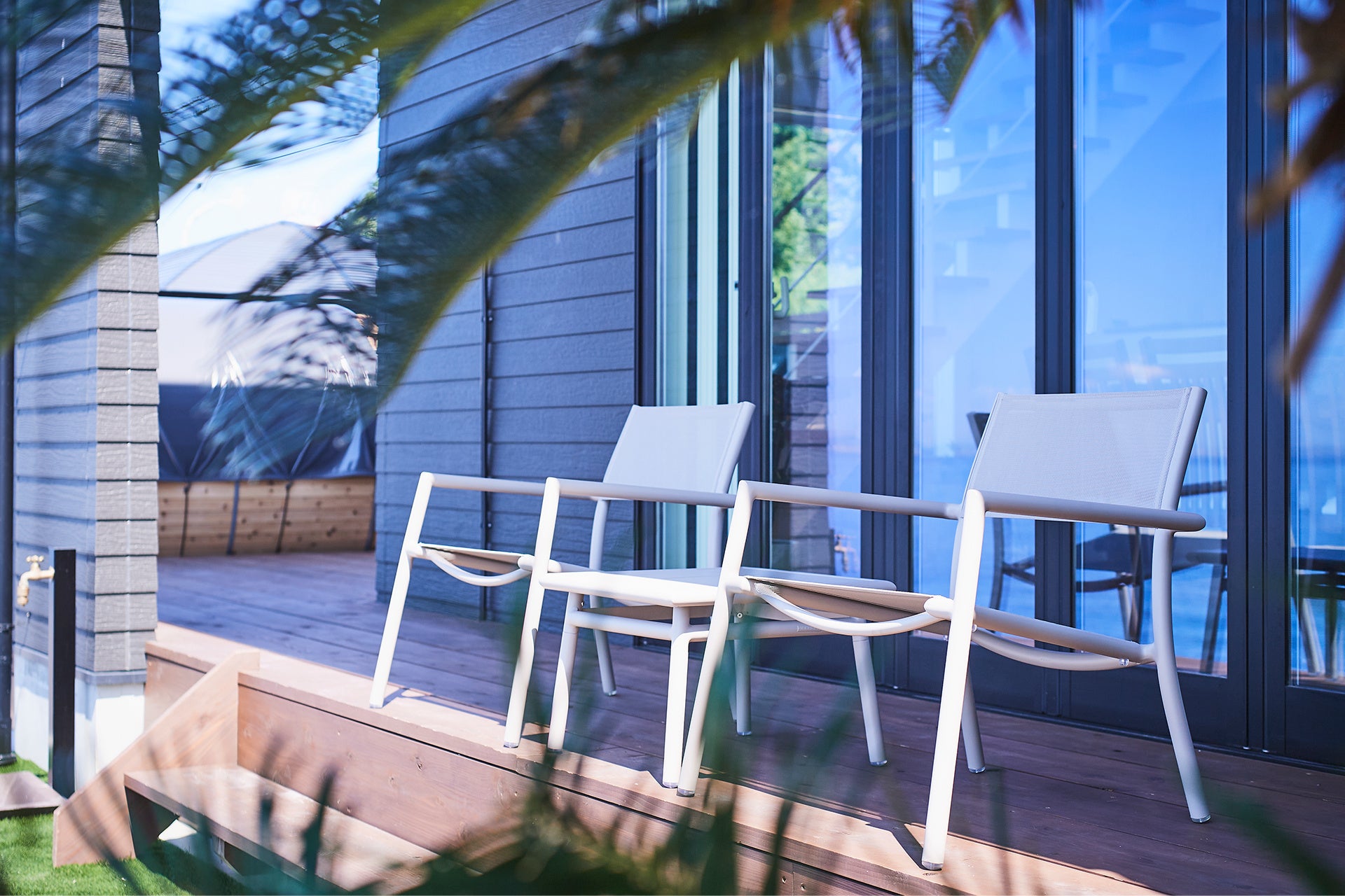 カリフォルニアを思わせる青を基調とした内装にこだわり、屋内外のさまざまな場所から海をお楽しみいただけます。また、隣接する棟や施設がないため、ほかの宿泊客を気遣う必要がなく、心からくつろげる環境を用意しました。