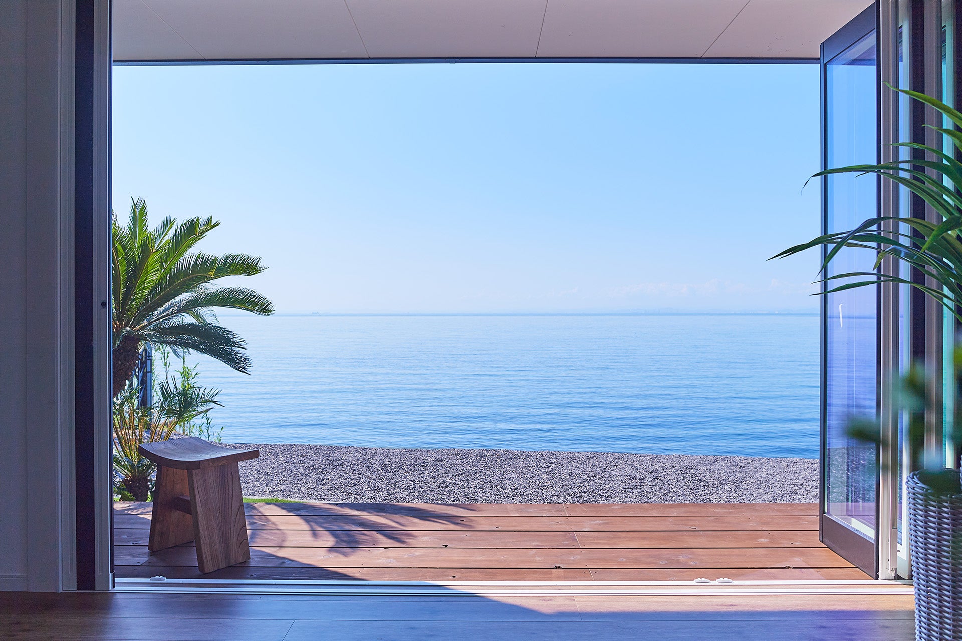 瀬戸内海の絶景オーシャンビューを望む一棟貸しの別荘です。リビングの大開口やバルコニーからプライベート・ビーチのような贅沢な景色が広がります。