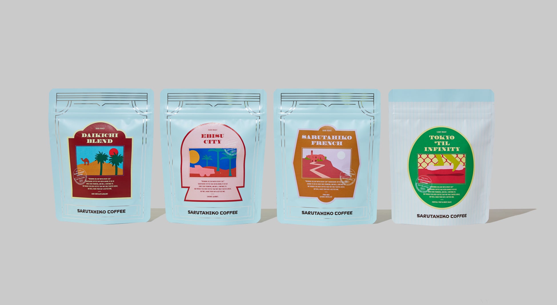 新しいコーヒー豆袋には、銘柄ごとに、映画のワンシーンを切り取ったような物語が設定され、そこからインスパイアされたデザインが施されています。猿田彦珈琲のシグネチャーカラーである猿田彦ブルーを基調に、それぞれの味わいのイメージや込められた思いを、ポップで華やかに表現しました。