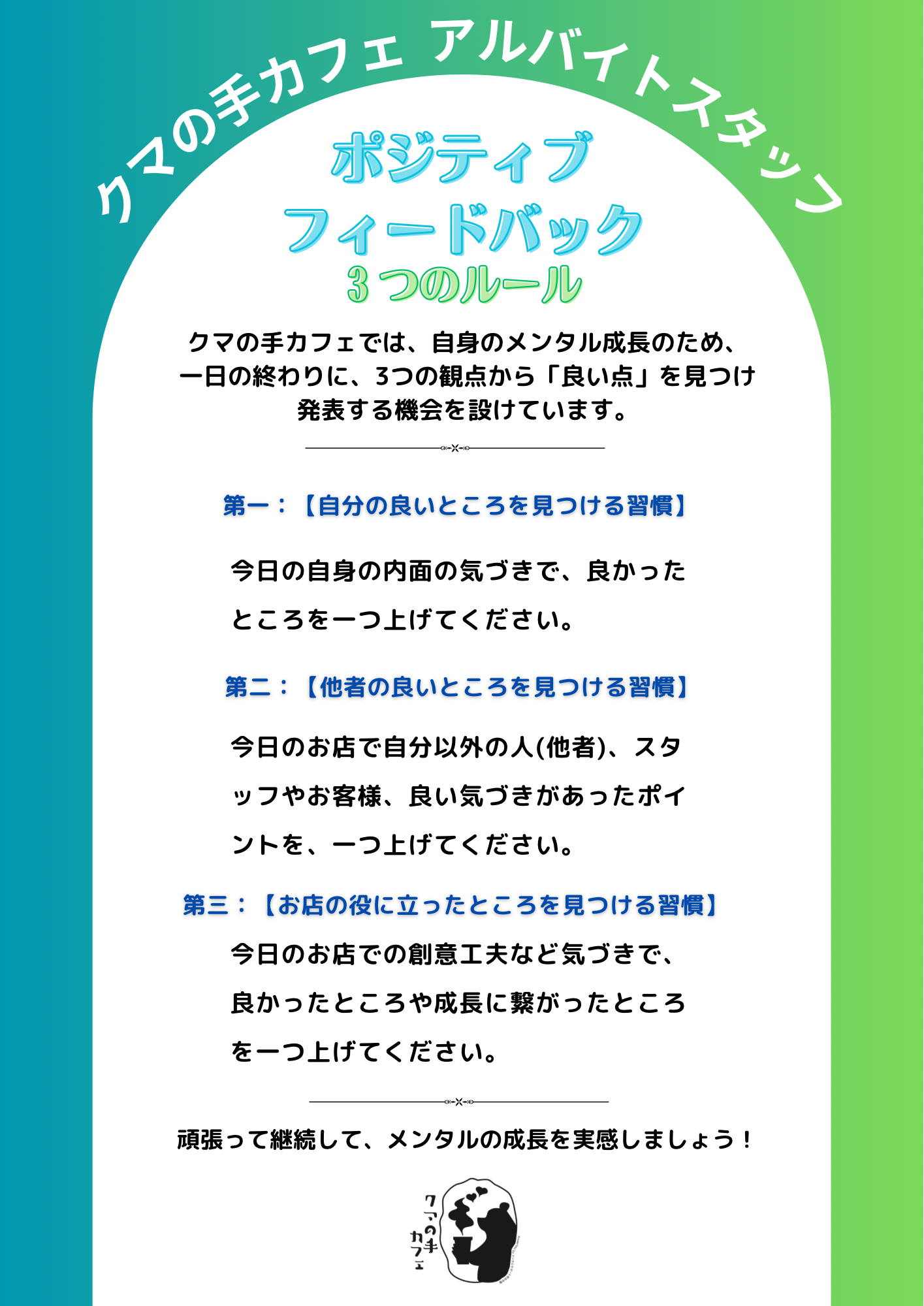 アルバイトスタッフに、お店をアップする時、3つのポジティブフィードバックを習慣づけています。