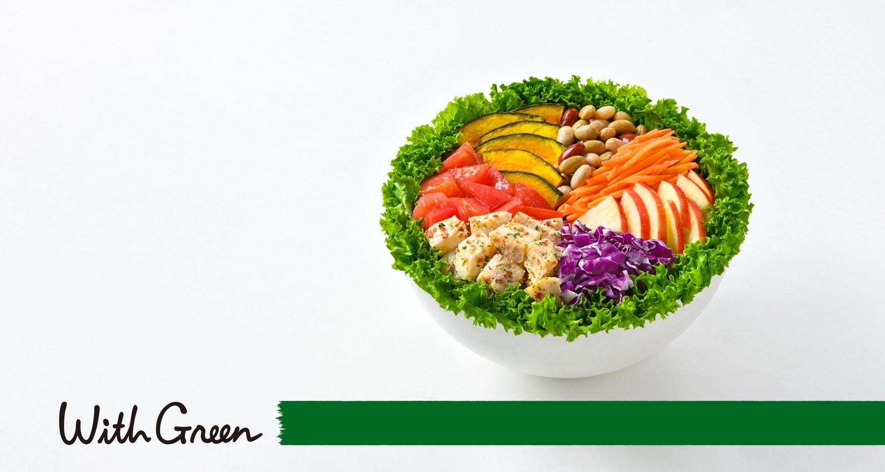 WithGreenは、お客様自身がその日の気分に合わせて、野菜やお肉、玄米などの様々なトッピングやドレッシングをお好みでセレクトいただける、“主食”になるサラダボウル専門店です。創業者である武文智洋がニューヨークで勤務していた際、チームの10人中4人~5人が代わる代わるランチに肉や穀物がたくさん入ったサラダを一食として食べており、自身も食べるようになりました。そのアメリカのサラダ文化を日本らしくアレンジし、ヘルシーで美味しいサラダボウルを提供します。