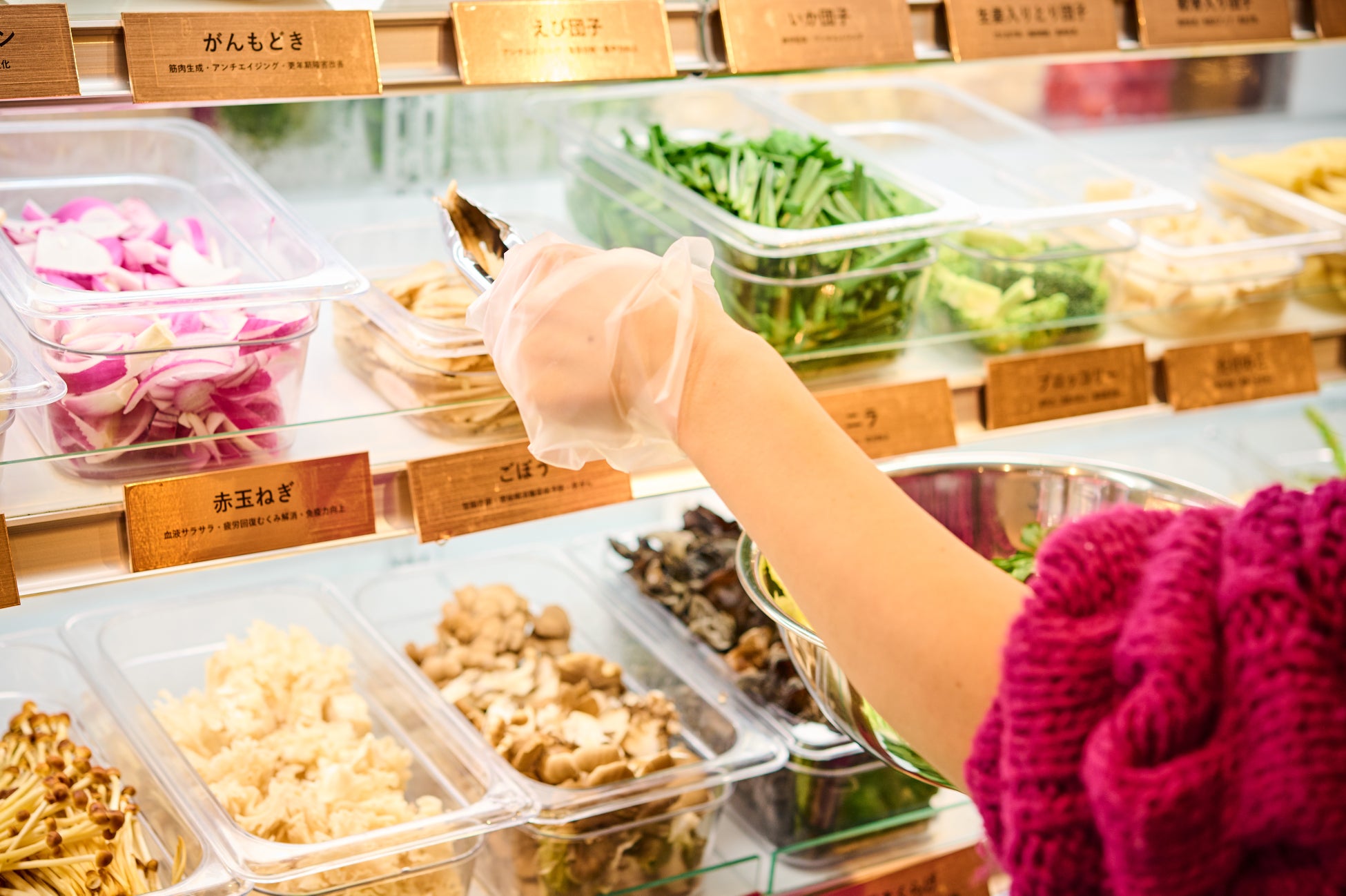 店内の冷蔵ケースに並べられた野菜や具材から