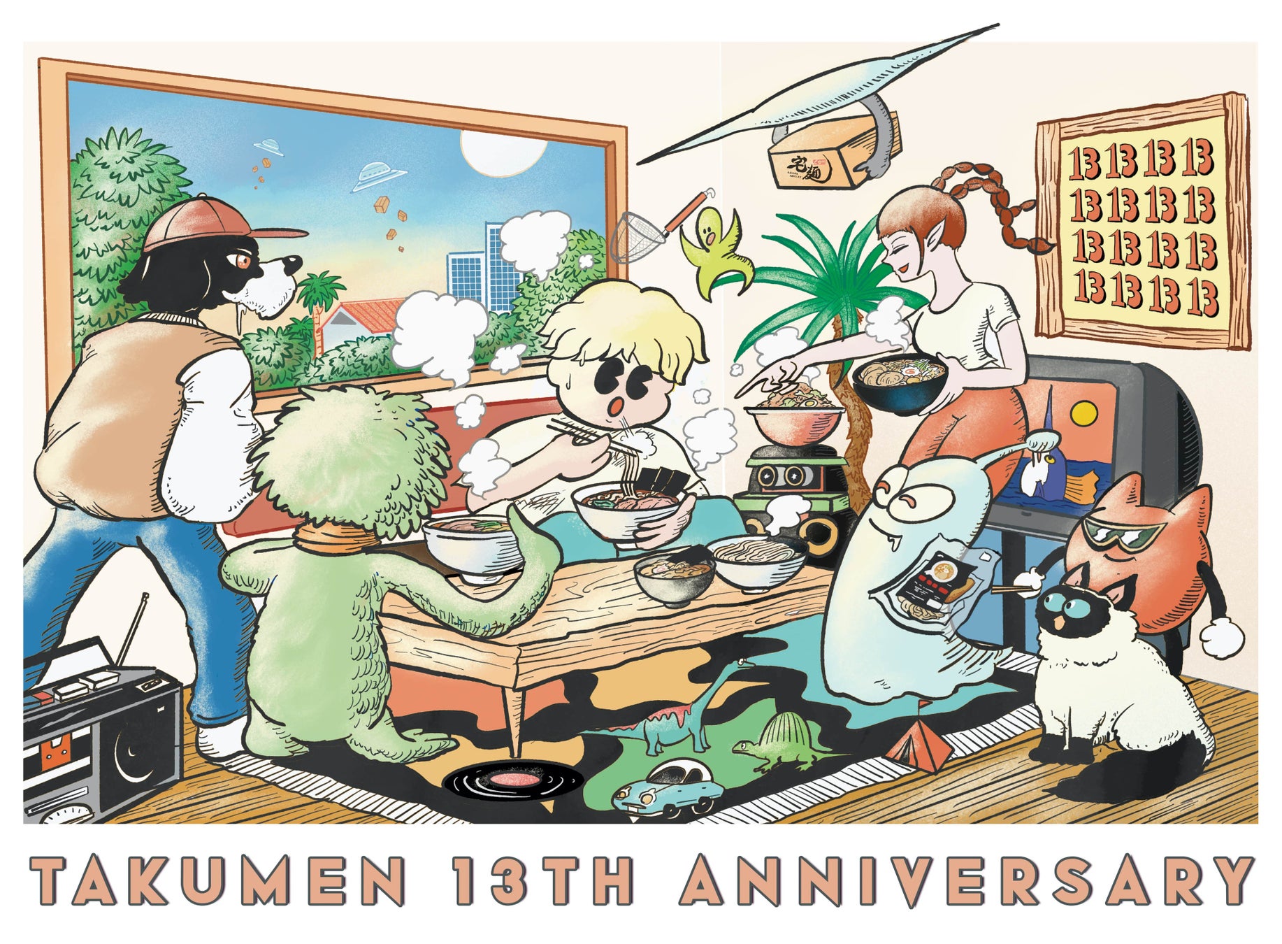 また、Tシャツと同じイラストに「TAKUMEN 13TH ANNIVERSARY」の文字を添えた60mm×80mmのステッカーは、8/23以降出荷される全てのご注文に無料で1枚同梱いたします(なくなり次第終了となります)。