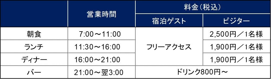 多様なスタイルの約130席がひとつの空間でつながるラウンジ「EL DORADO エル・ドラド」は、朝7時から深夜3時まで、人数・時間・シーンにあわせた使い方が可能です。朝食からディナータイムまではブッフェ形式のフードプレゼンテーションを行い、21時以降はバーラウンジとして、照明を落とした大人の空間でお過ごしいただけます。滞在中の宿泊ゲストは客室以外にくつろげる「もうひとつのリビングルーム」として自由にアクセス可能です。また、ビジターも利用可能です。細部までデザインされた空間と自由にセレクトできる食を通じて、他では体験できない過ごし方を提案します。