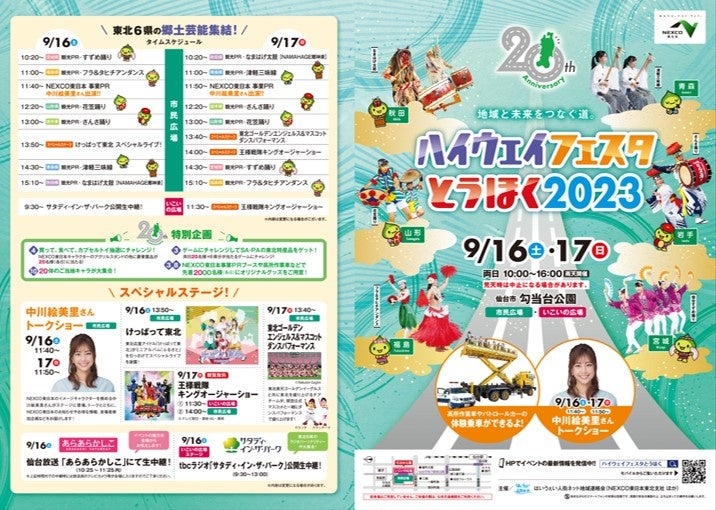 はいうぇい人街ネット(NEXCO東日本東北支社[仙台市宮城野区]ほか)は、令和5年9月16日(土)・17日(日)に仙台市の勾当台公園において、「ハイウェイフェスタとうほく2023 ~地域と未来をつなぐ道。~」を開催します。