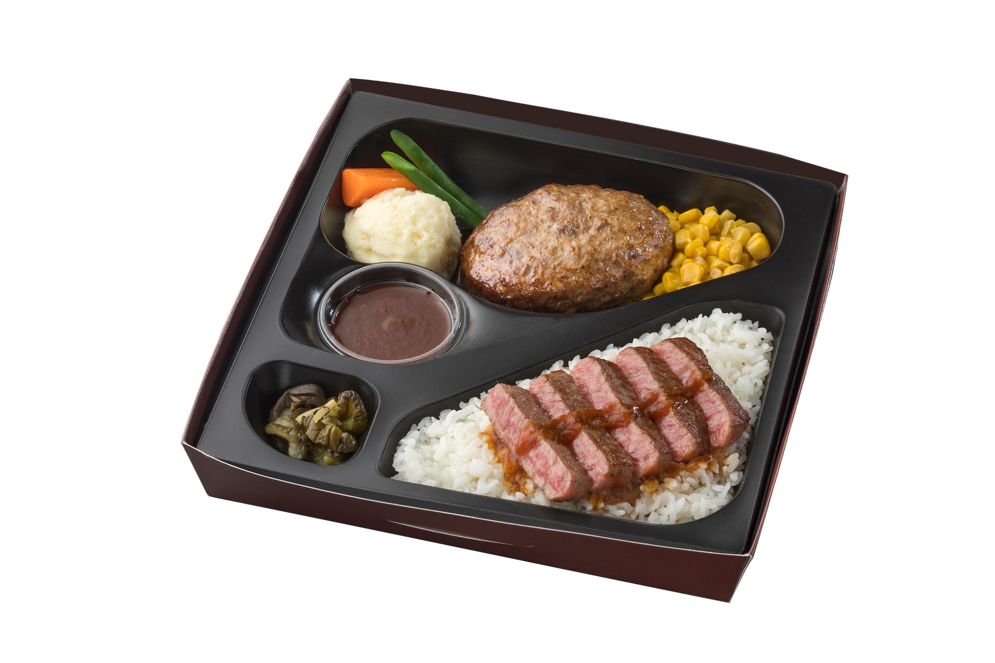 全国から選び抜いた黒毛和牛で作るハンバーグ&ステーキ弁当などをご用意