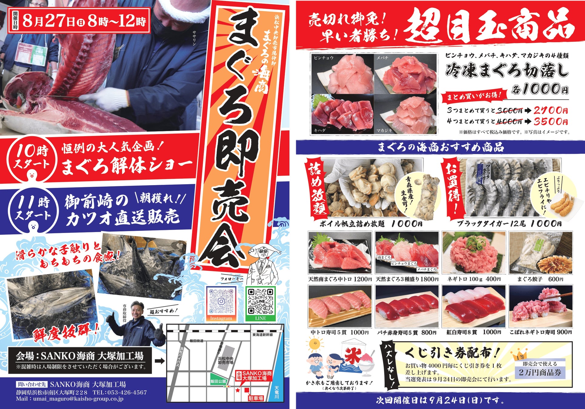 毎月恒例!浜松仲卸『SANKO海商』の「まぐろ即売会」は、本まぐろ解体ショーに青森県産ボイルホタテ詰め放題などイベント盛りだくさんで、2023年8月27日(日)8:00~12:00に開催!