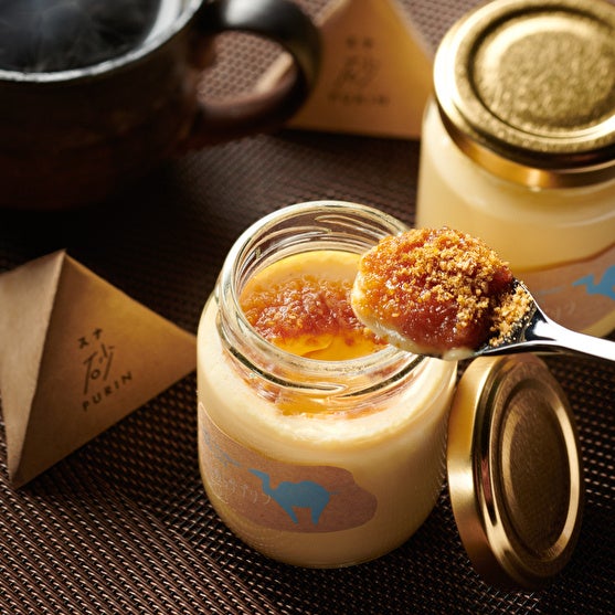 鳥取砂丘をコンセプトにしたプリンづくりとして、液体のカラメルではなく独自に開発した粉末のカラメルをつくっています。その粉末カラメルをかけて召しあがるプリンは、ジャリっとした食感が癖になる今までにない新感覚プリンです。