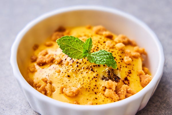上品な脂のりともっちりとした肉質が自慢の“ふくいサーモン”と、最上級と言われる“九頭竜まいたけ”の旨味をたっぷりご堪能いただけるように、小鍋の七輪仕立てをご用意しました。メインには、 福井県の日本酒・黒龍の酒粕を飼料として育った“黒龍吟醸豚”を塩麴焼きにしてご提供します。柔らかな肉質と良質な脂の甘みをご賞味ください。デザートはしっかりとした甘みとしっとりした食感、鮮やかな黄色が映える