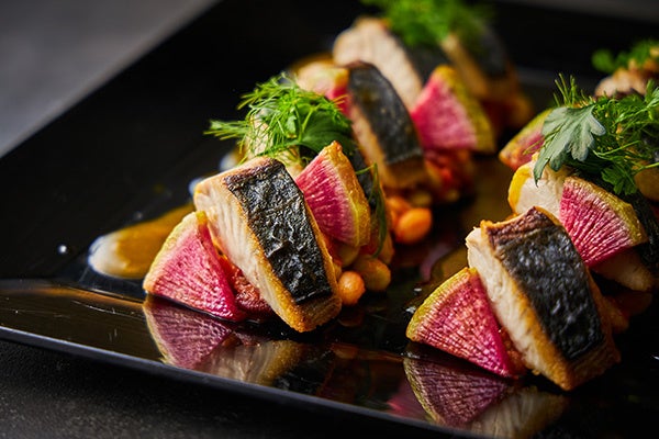福井県では“サンペイ”と呼ばれる高級魚“マヒマヒ”を鉄板で焼き上げ、ふっくらとした身の上には色鮮やかな野菜のピクルスを乗せて仕上げました。赤ピーマンやアーモンドをメインに使ったロメスコソースに、シェリービネガーを加えたアレンジソースとの相性をお楽しみ