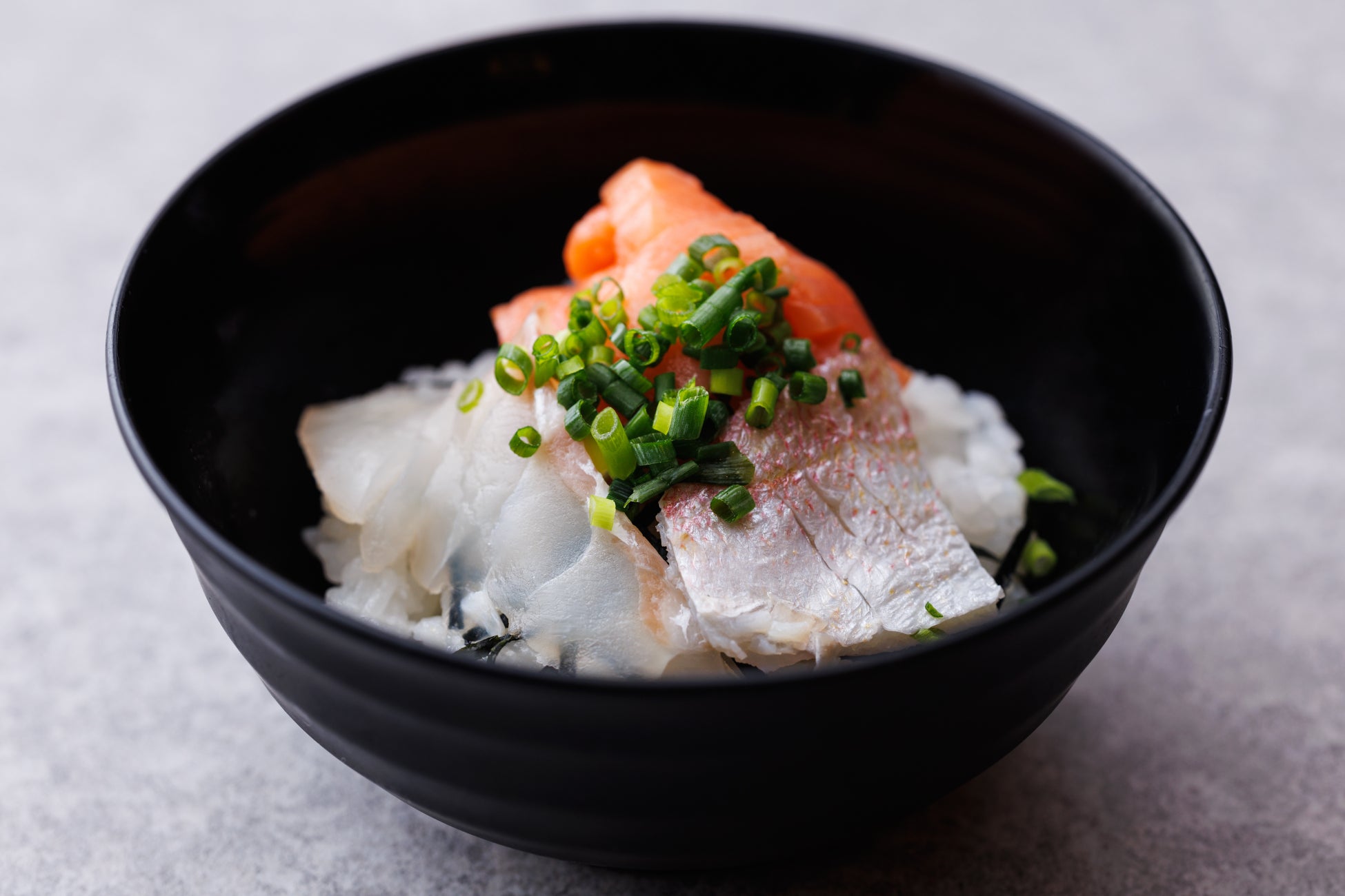 “蓮子鯛”、“サーモン”、シェフが厳選するその時々の美味しい“白身魚”の3種類がのったどんぶりです。福井県産の海の幸を存分にご堪能いただけます。