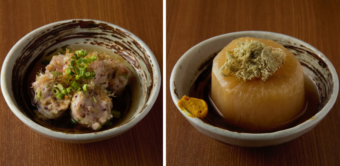 左)マダコを贅沢に使用した手仕込みの「蛸つみれ」は、注文を受けてから出汁に入れ、ゆっくりと仕上げるため、ふわふわで蛸の旨みがたっぷり詰まった大人気の看板メニューです!右)当店人気NO.1の 「大根」 は、多くのお客様がオーダーされるおでんの定番商品!毎日店内で丁寧に仕込んだ大根を、風味豊かなあごだしで時間をかけじっくり炊き上げることで、分厚いカットでも柔らかく、中までしっかり味が染み込み込んでおり、まさに手間暇かけた逸品です!