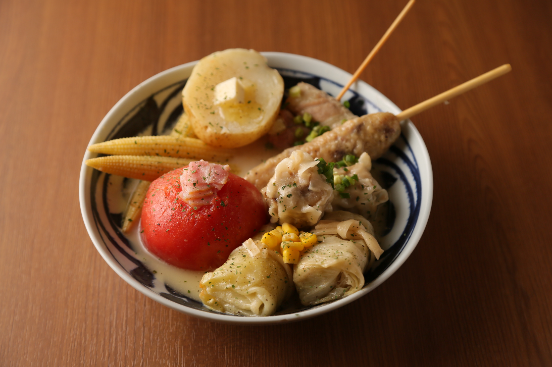 鶏の旨味が凝縮した白濁濃厚な「鶏だしおでん」イメージ:(上から時計回りに)じゃがバタ― / 牛タンつくね / 焼売 / ロールキャベツ / トマト / ヤングコーン