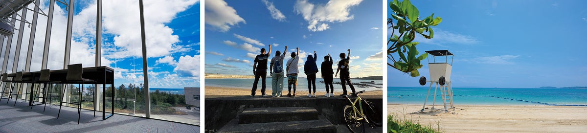 ワークスペースがあるのは那覇空港から車で約1時間の沖縄本島中部に立地する「宜野座村」。海に面した宜野座村サーバーファームでのリゾート感あふれるオンタイムと大自然を活かしたアクティビティなど宜野座村の魅力を満喫するオフタイムでリフレッシュしながら、仕事の効率もアップする「リゾートワーケーション」の体験が可能です。